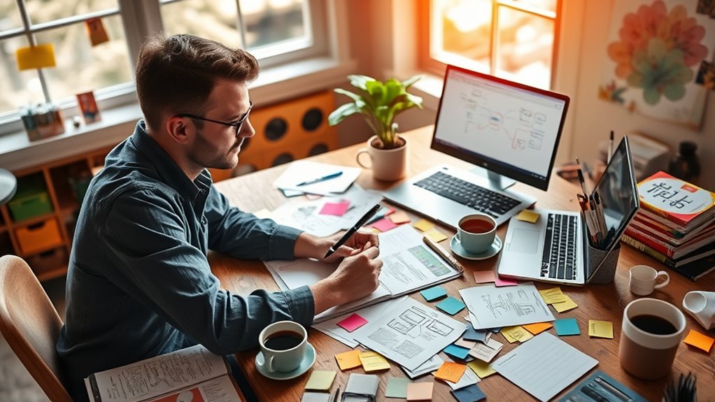 Many people mistakenly muddle through with design thinking by overthinking assumptions and neglecting empathy. You might rush to solutions without fully understanding the problem or overlook others’ perspectives, causing poor results. Avoid these mistakes by pausing to question assumptions and practicing empathy. Remember, patience and understanding propel personal growth, ensuring your problem-solving process is practical, perceptive, and productive. Focus on feeling, not just fixing.