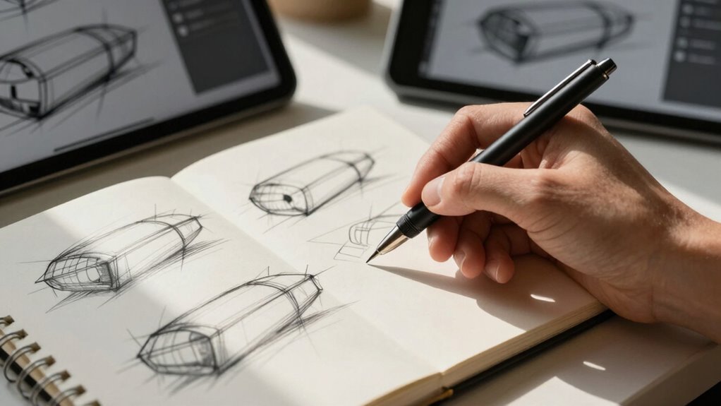 Additionally, incorporating design thinking principles can help you better understand user needs and develop more innovative solutions throughout your sketching process. Establishing a consistent sketching routine can further accelerate your ability to generate and refine ideas efficiently.