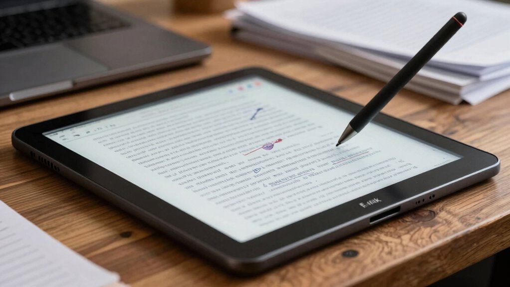 E-ink annotation offers a more paper-like experience compared to traditional tablet screens. You’ll find handwriting accuracy improves with e-ink, making note-taking smoother. Plus, e-ink screens considerably reduce glare, so your eyes stay comfortable during long reading or writing sessions. Unlike glossy tablet displays, e-ink provides a more natural feel, making it ideal for annotating PDFs or making quick notes without the distractions of reflections or eye strain.