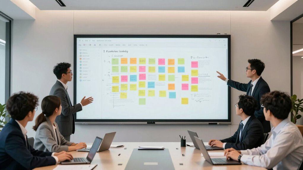 To use interactive boards effectively in a hybrid team, you need to establish clear guidelines for collaboration and participation. This encourages consistent virtual engagement from all team members, whether remote or in-office. Set expectations for how and when team members contribute, ensuring everyone feels included. Use creative visualization techniques to make ideas more accessible and engaging, such as color coding, diagrams, or multimedia elements. This helps clarify complex concepts and stimulates participation. Encourage active involvement by prompting questions and feedback during sessions. Regularly review and update the board to keep it relevant and useful. Incorporating empathy into your approach ensures that diverse perspectives are understood and valued, fostering a more inclusive environment. When everyone knows how to contribute and visualizes ideas clearly, your hybrid team will collaborate more efficiently, leveraging the full potential of interactive boards. Additionally, understanding the importance of effective collaboration can help prevent common pitfalls and improve overall team productivity. Recognizing power output and how it relates to team engagement can further enhance the effectiveness of your collaborative efforts. A focus on team dynamics can help optimize how team members interact with the interactive tools, ensuring everyone’s input is valued and utilized. Moreover, considering visualization techniques can significantly improve communication and understanding within the team, making collaboration smoother.