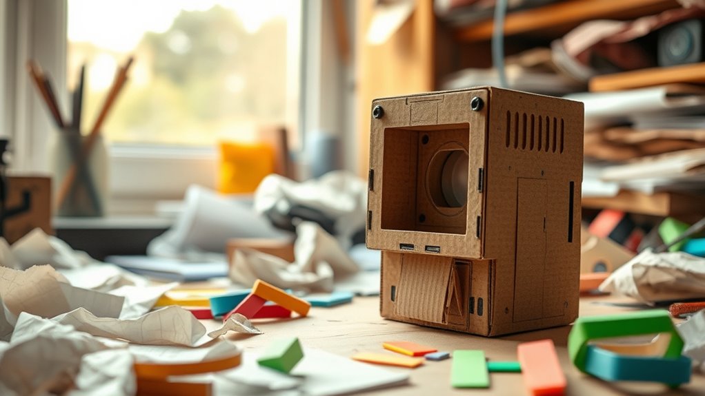 For DIY material selection, consider foam boards, cardboard, and 3D printing filaments like PLA or ABS for cost-effective fabrication. These materials are easy to access, inexpensive, and versatile, making them perfect for rapid prototyping. You can also use inexpensive plastics, acrylic sheets, or even recycled materials to create functional models without breaking the bank. These options help you quickly iterate designs while staying within your budget.