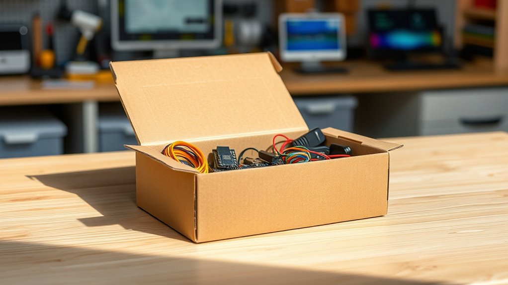 A typical discovery box includes a carefully curated selection of tools and materials designed to kickstart your prototyping process. You’ll find versatile components that enable prototype customization, allowing you to adapt designs quickly without starting from scratch. These might include basic electronics, sensors, and modular parts suited for your project’s needs. To keep shipping costs manageable, the box emphasizes lightweight, compact items that provide maximum value. You’ll also receive instructional guides and sample materials to help you understand how each component works together. This setup allows you to experiment, iterate, and refine your prototype efficiently. Additionally, including essential components related to your project’s goals can streamline your development process and enhance functionality. With these key components, you can explore different configurations without the hassle of sourcing individual parts, making remote prototyping more accessible and cost-effective.