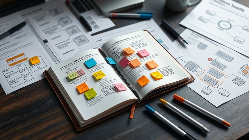 To master design thinking, you’ll rely on key templates like empathy maps, journey maps, and ideation sheets, which help you understand user needs, visualize experiences, and generate innovative ideas. Prototyping tools streamline testing, while feedback forms keep solutions user-centered. These templates facilitate rapid iteration and practical problem-solving. Keep exploring these essential tools, and you’ll find yourself increasingly confident in creating impactful, user-focused solutions that truly resonate—more insights await as you continue your journey.