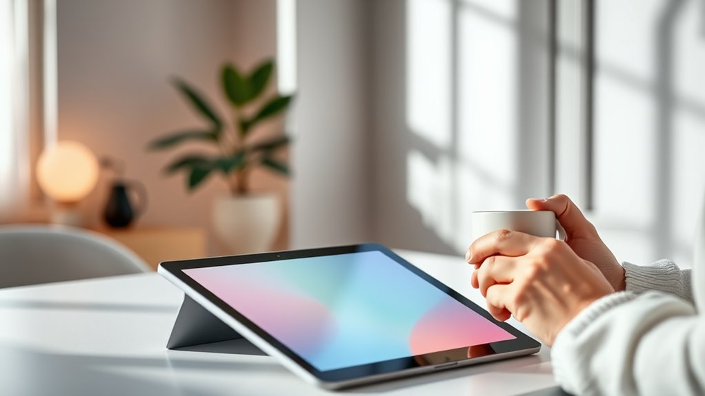 Alongside mindful notifications, ergonomic interfaces play an essential role in promoting your mental health. These are designs that prioritize your comfort and ease of use, minimizing physical strain and cognitive load. Think about how often you strain your eyes or hunch over your device; ergonomic interfaces aim to eliminate those issues by adjusting font sizes, contrast, and layout to suit your natural posture and visual comfort. From adjustable text sizes to intuitive navigation, these design choices help you use devices longer without discomfort. When interfaces are ergonomic, you’re less likely to experience fatigue, frustration, or anxiety, making your digital experience more sustainable and enjoyable.