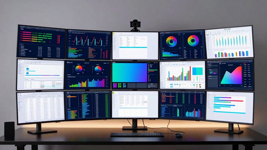 When selecting a 49-inch ultrawide monitor for multitasking, I focus on factors like screen size and curvature to guarantee comfort and immersion. I also pay attention to resolution and color accuracy so my work stays sharp and true to life. Finally, I consider connectivity options and ergonomic features to create a setup that’s both functional and comfortable for long hours.
