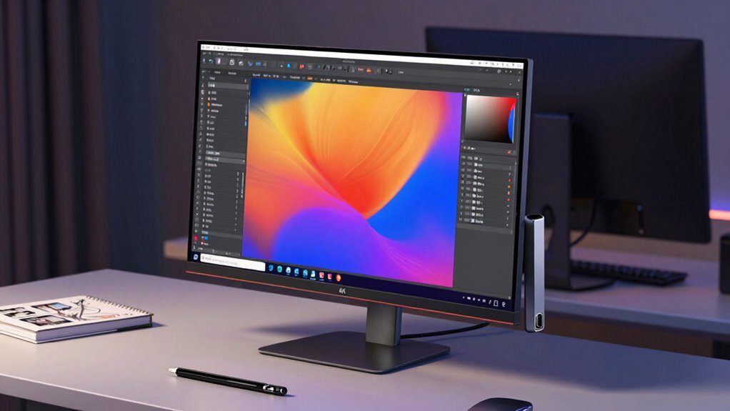 Ever wondered what makes a 4K monitor truly suitable for professional design work? It’s all about display quality and color accuracy. A top-tier monitor should support at least 8-bit color depth and cover wide gamuts like sRGB or DCI-P3, ensuring vibrant, true-to-life colors. HDR support, such as HDR10 or DisplayHDR 400, enhances contrast for more realistic images. Color accuracy is essential, so look for monitors with low ∆E values—closer to zero—indicating precise color fidelity. Factory calibration or professional calibration support guarantees consistent output for critical tasks. Monitors supporting 100% sRGB or broader color spaces like Adobe RGB are ideal, delivering the rich, accurate visuals that designers need to produce high-quality work with confidence.