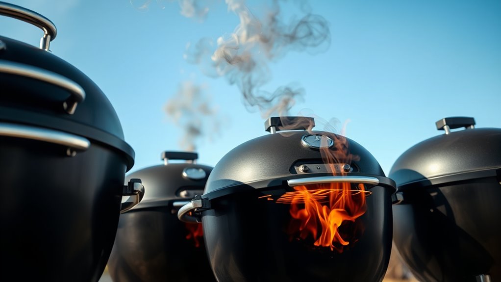 Effective temperature control is essential for achieving perfect grilled dishes, and many charcoal grills offer features that make this easier. Adjustable air vents or dampers allow me to precisely regulate airflow, which directly affects the heat by controlling oxygen supply to the fire. Built-in thermometers help me monitor internal temperatures in real-time, ensuring consistent heat throughout cooking. Some grills have multiple dampers or vents that can be used simultaneously, giving me the ability to fine-tune heat levels or create different zones for smoking and direct grilling. Charcoal pans with adjustable heights or cranks let me move coals closer or further from the grate, adjusting heat intensity easily. Features like lid locks or vent closures further enhance control, helping me manage heat retention or extinguish the fire when needed.