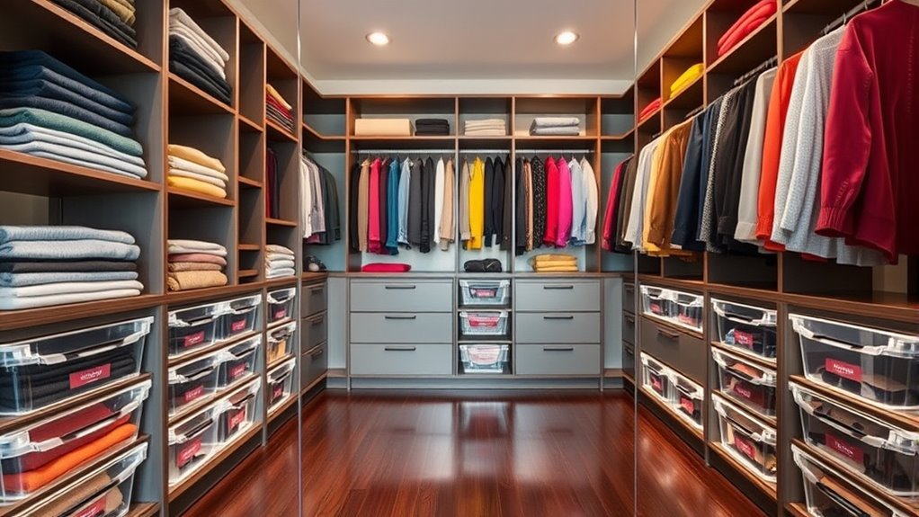 Adjustable storage options play a key role in creating a flexible and personalized closet setup. They let you modify shelf heights, rod lengths, and compartments to suit different clothing sizes and accessories. Shelving and hanging rods that can be expanded or reconfigured accommodate changing storage needs as your wardrobe evolves. Modular systems with adjustable components can be customized to fit various closet widths, typically from 4 to 15 feet. The ability to add or remove shelves and rods helps maximize space, especially in tight or irregularly shaped closets. Plus, adaptable features support long-term use by adapting to new items, seasonal changes, and personal organizational preferences. This flexibility ensures your closet remains functional and tailored to your lifestyle over time.