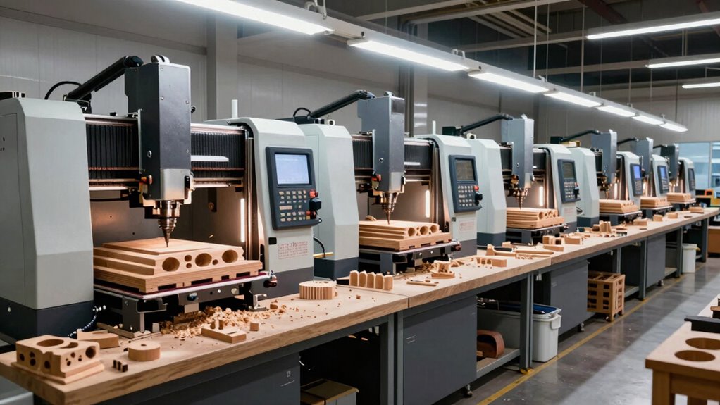Selecting a CNC machine that matches your wood material needs is essential for achieving precise and efficient results. You need to verify the machine can handle the specific types of wood you plan to work with, whether hardwood, softwood, or composite materials. Check the maximum spindle power and speed to confirm it can carve or engrave detailed designs into different wood densities. Confirm support for the necessary tool collet sizes, like ER11 or ER20, compatible with your cutting tools. Also, consider the machine’s ability to process varying thicknesses, ensuring adjustable Z-axis clearance for different wood depths. Ultimately, make sure the software and hardware can deliver high-quality, precise cuts on your chosen wood materials, ensuring your prototypes come out perfectly.