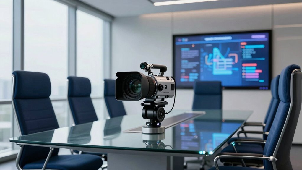 To select the right conference camera for a medium-sized boardroom, it’s essential to take into account its field of view and how well it can cover the entire space. For effective coverage, look for cameras with a 120° to 180° field of view, ensuring all participants and areas are visible. Adjustable zoom and pan features are valuable, allowing you to focus on specific areas or individuals as needed. High resolution, such as 4K or higher, guarantees clear images, even in larger rooms. Additionally, verify the microphone’s range and quality to capture voices clearly from across the room. Features like AI auto-framing, speaker tracking, and multiple presets help the camera adapt seamlessly to different room configurations and meeting dynamics, making sure no one is left out of the conversation.