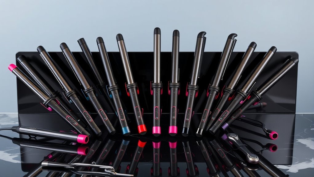 Choosing the right barrel size is essential because it directly influences the curl type you’ll achieve. Smaller barrels, around ¾ to 1 inch, create tighter curls perfect for defined ringlets. Larger barrels, 1.25 to 1.5 inches, produce looser waves ideal for a relaxed, beachy look. Longer barrels over 8 inches are great for styling long hair efficiently, as they allow wrapping larger sections at once, saving time. The size of the barrel also affects the curl’s durability and volume; medium-sized barrels strike a balance, suitable for most hair types and styles. If you want versatility, multi-barrel sets let you switch between sizes, giving you options for different looks without multiple tools. Your choice should match your desired hairstyle, whether it’s tight curls, soft waves, or voluminous waves.