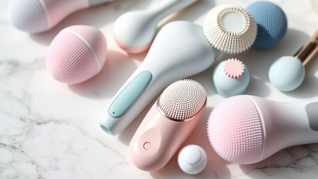 I recommend gentle silicone brushes for sensitive skin, exfoliating brushes for dullness, and deep-cleaning brushes for oily or acne-prone skin. I find that choosing a brush with adjustable speed settings helps customize your routine. Always pick a brush suited to your skin type to avoid irritation. Experimenting with different types can really help you find what works best for your unique skin concerns.