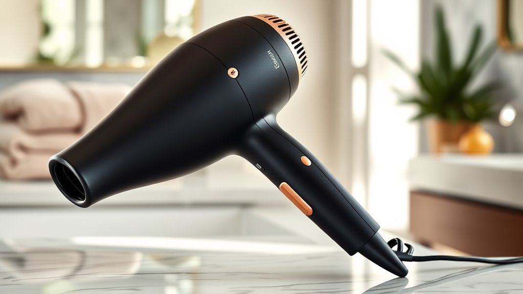 Ionic technology is a game-changer because it actively reduces frizz and static by releasing negative ions that neutralize electrical charges in your hair. This process helps to seal the cuticle, locking in moisture and leaving hair shinier and smoother. With ionic dryers, drying time decreases since they promote faster evaporation of moisture from hair strands, saving you time. They also minimize heat damage by allowing lower heat settings without sacrificing styling power. Regular use of ionic technology can improve your hair’s overall health, making it softer, more manageable, and less prone to damage. If you’re after a dryer that enhances shine, reduces frizz, and promotes healthier hair, ionic technology is definitely worth considering in your choice.
