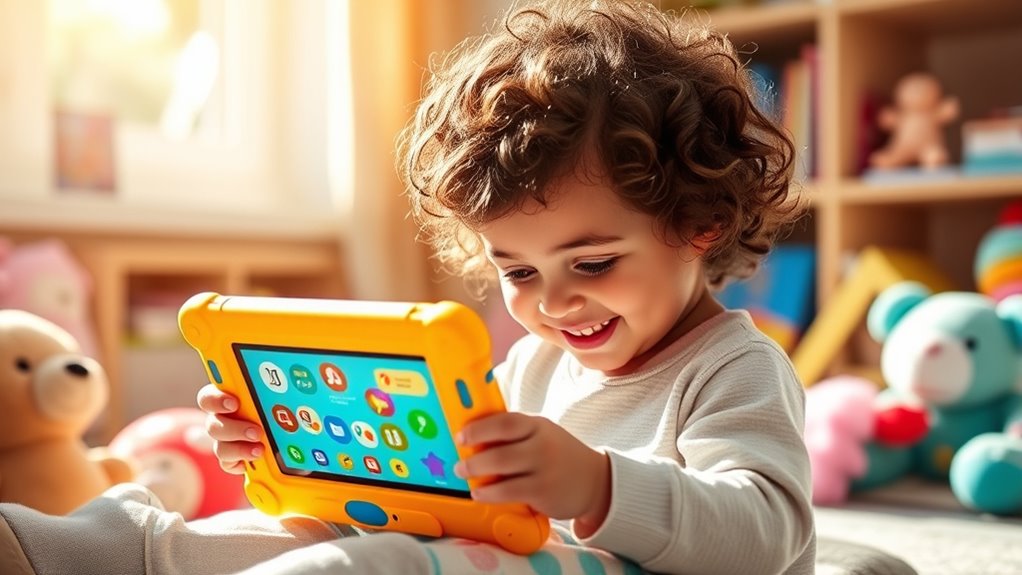 If you’re looking for the best kids tablets that are fun, safe, and educational, I’ve found a great list that parents recommend. These devices feature rugged designs, vibrant screens, and parental controls to keep your child secure. They also come with engaging content and long battery lives for active use. From Amazon Fire models to Android options, there’s something for every age. Keep exploring to uncover which one suits your child’s needs perfectly.