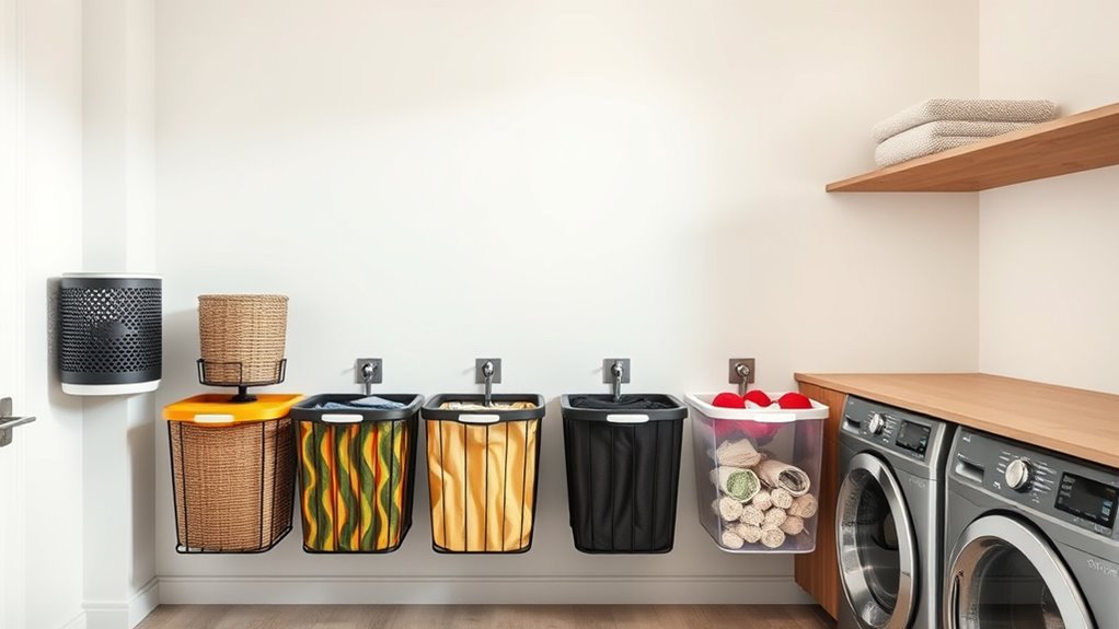 I always look for hampers made of plastic or metal because they resist moisture better than fabric. Picture a sleek, waterproof plastic bin sitting in my laundry room, untouched by humidity or spills—it’s durable and easy to clean. Metal hampers with powder coating also work well, providing a sturdy, moisture-resistant surface. These materials keep my laundry area dry and help prevent mold or mildew buildup.
