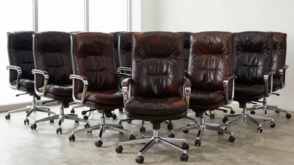 Selecting a leather ergonomic chair for executives requires paying close attention to durability standards, as the material must withstand daily use without deteriorating. High-quality leather should be scratch-resistant, stain-resistant, and crack-resistant to guarantee long-term performance. Many top-tier leathers undergo testing for wear resistance and colorfastness, helping maintain their appearance and functionality over time. Certifications like SGS indicate the leather meets strict safety and durability criteria, giving added peace of mind. Additionally, the backing and filling, such as high-density foam or high-loft fiber, contribute notably to the chair’s overall durability and comfort. Regular cleaning and maintenance are essential for preserving the leather’s integrity, extending the lifespan, and ensuring the chair remains professional and inviting for years to come.