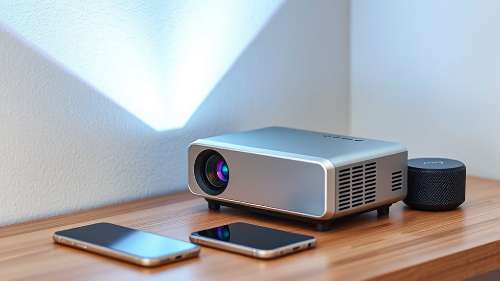 To get the most out of your mini projector, it’s vital to evaluate its compatibility options carefully. Look for models that support multiple connection interfaces like HDMI, USB, AV, and audio ports, making sure you can connect to various devices easily. Verify that the projector works seamlessly with your device’s operating system—whether iOS, Android, Windows, or macOS—to avoid compatibility issues. Wireless streaming features like WiFi and Bluetooth are also necessary for cable-free connections with smartphones, tablets, and speakers. Additionally, check if the projector supports popular media devices such as streaming sticks, gaming consoles, and laptops to expand your entertainment options. Finally, verify it’s compatible with necessary adapters or dongles, like HDMI adapters for smartphones, to maximize versatility.