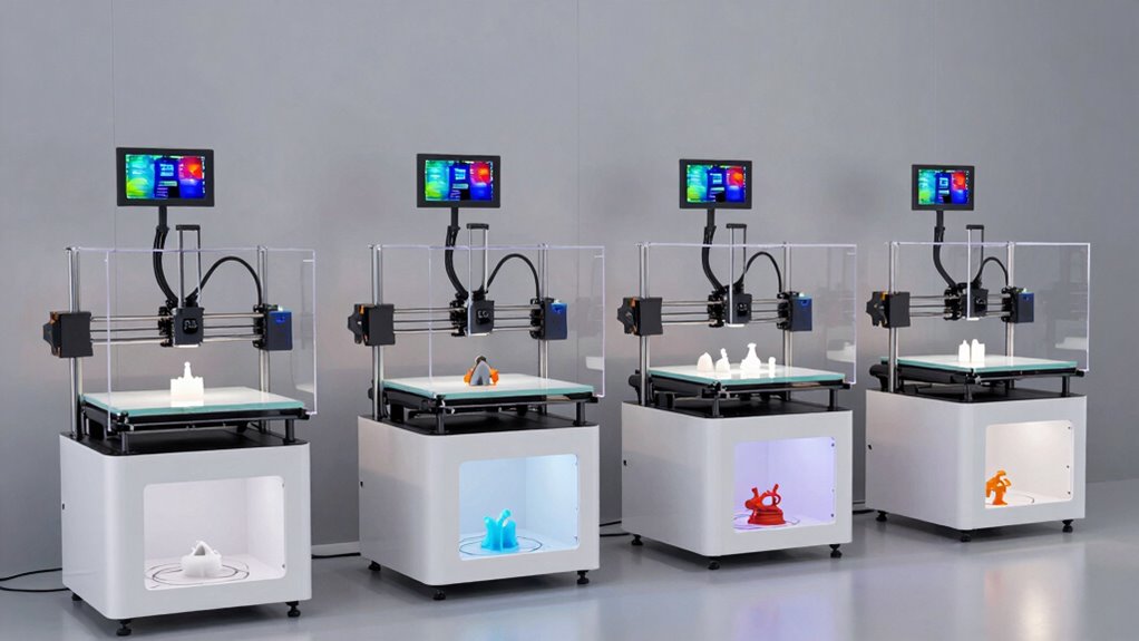 Build volume size is a key factor that influences the scope and scale of your projects. A larger build volume allows you to print bigger models or multiple smaller items at once, boosting productivity. It also determines the maximum dimensions of models you can print in a single job. However, bigger build volumes typically mean more resin consumption and longer print times. On the other hand, smaller build volumes are ideal for detailed miniatures and prototypes, but they limit the size of finished models. To choose the right printer, consider your typical project size and complexity. Finding a balance between capacity and detail guarantees you get a machine that fits your needs without unnecessary waste or delays.
