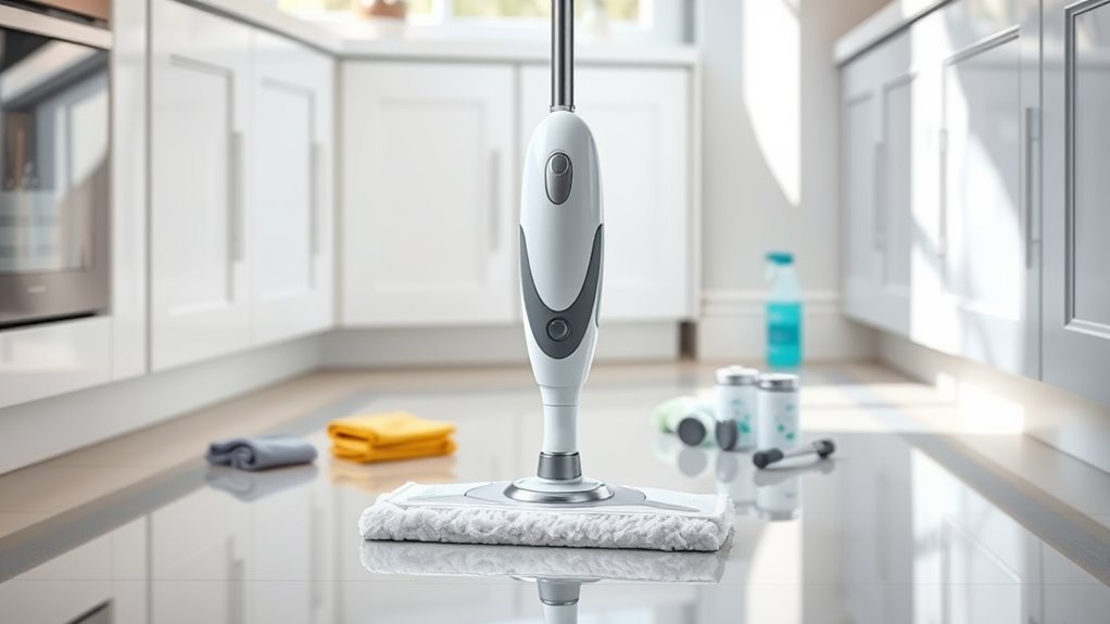 When selecting a steam mop, prioritizing safety features is essential to guarantee worry-free cleaning. Look for models with automatic shut-off systems that activate if the mop overheats or runs out of water, reducing fire risks. Child-lock mechanisms are vital for preventing accidental steam activation around kids. Opt for units with heat-resistant, non-slip handles to avoid burns and slips during use. Cord safety features like insulated cords and cord clips help minimize tripping hazards and electrical issues. Some models also include protective shields or covers that prevent hot steam from escaping unexpectedly, safeguarding users from burns. These safety features not only protect you but also make your cleaning experience safer and more confident, especially in homes with children or pets.