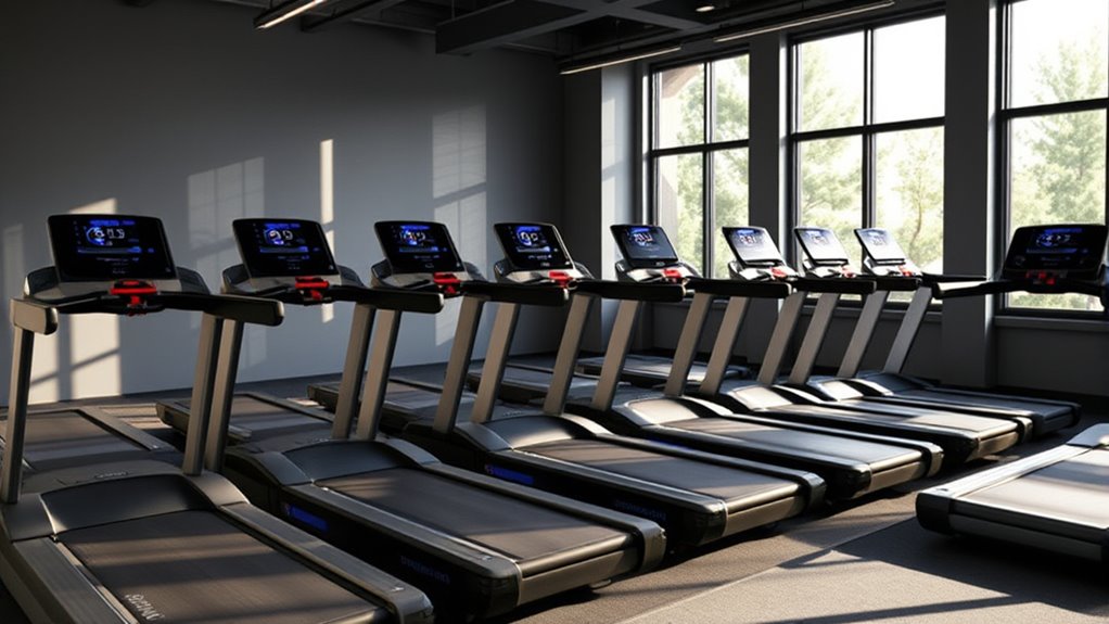 Have you ever considered how incline and decline features can take your treadmill workouts to the next level? These options allow you to simulate varied terrains, boosting workout intensity and muscle engagement. Most models offer adjustable inclines up to 15%, with some providing decline settings of up to -3%, mimicking downhill running. Incorporating incline training can increase calorie burn by up to 50%, making your workouts more efficient. Automatic incline adjustments, managed via console controls or connected apps, enable seamless shifts during routines. A wider range of incline and decline options supports diverse fitness goals—from endurance and hill sprints to rehab exercises. When choosing a treadmill, consider these features to add variety, challenge, and effectiveness to your home workouts.