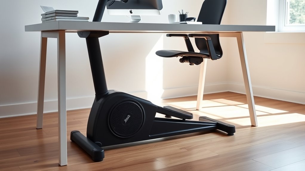Ever wondered how these devices keep you safe while you’re multitasking? Most under-desk ellipticals come with safety features like anti-slip pedals, low resistance settings, and sturdy frames to prevent accidents. Some even have built-in stop buttons for quick pauses. I always recommend choosing models with these features, so you can focus on your work and workout without worry, turning your desk into a safe, active space.
