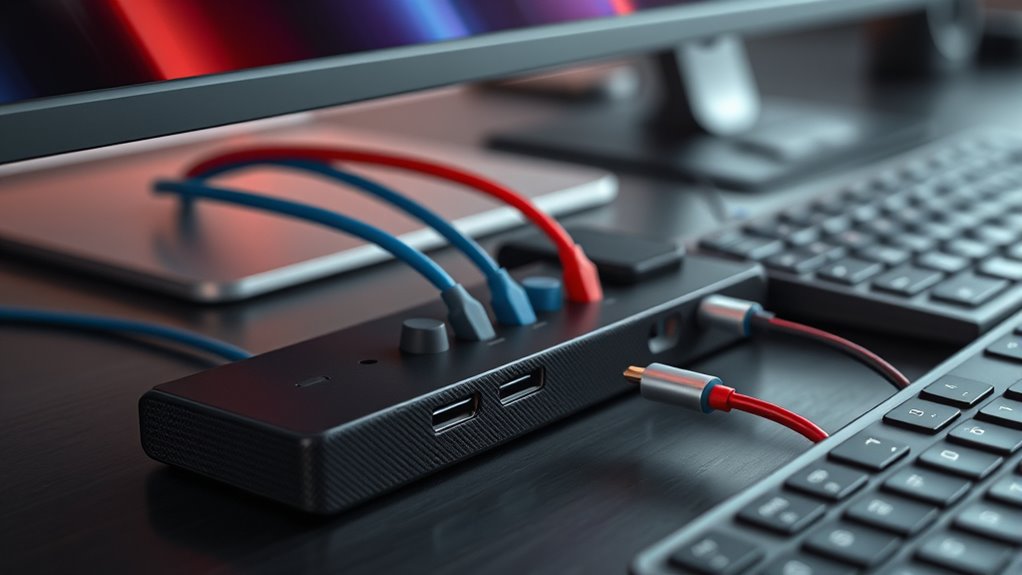Security features on docking stations include hardware encryption, secure boot options, and trusted platform modules (TPMs) that protect your data. I always look for stations with built-in firewalls, biometric access, and firmware updates to patch vulnerabilities. These features help guarantee my data stays safe, especially when connecting to public or untrusted networks. Investing in a docking station with robust security gives me peace of mind and keeps my sensitive information protected.
