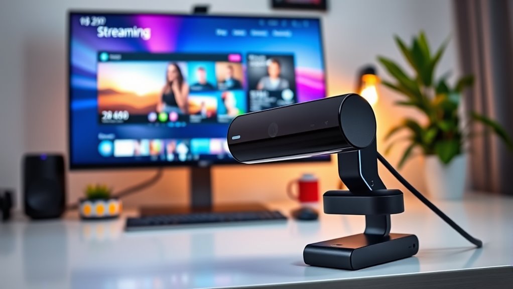 Higher frame rates like 60FPS deliver smoother motion, which is especially important for fast-paced streaming and gaming. Most webcams support 30FPS as standard, but 60FPS offers a more professional look by reducing motion blur and making movements appear more natural. Streaming platforms often optimize for either 30FPS or 60FPS, so choosing the right frame rate guarantees compatibility and peak performance. Keep in mind, higher frame rates demand more processing power and bandwidth, which can strain your system if it’s not equipped accordingly. Some webcams can automatically switch between frame rates based on lighting conditions and system performance, helping maintain consistent video quality without overloading your hardware. Ultimately, selecting a webcam with good frame rate options ensures your streams look smooth and professional.