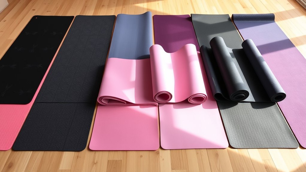 The texture of a yoga mat gently guides your practice, impacting grip and slip resistance more than you might think. A textured surface creates subtle friction, helping prevent slips during your flow. Smooth mats might feel sleek but can be tricky if your hands or feet get sweaty. I find that a slightly textured mat offers the perfect balance—giving you confidence and stability, whether you’re practicing indoors or outdoors.